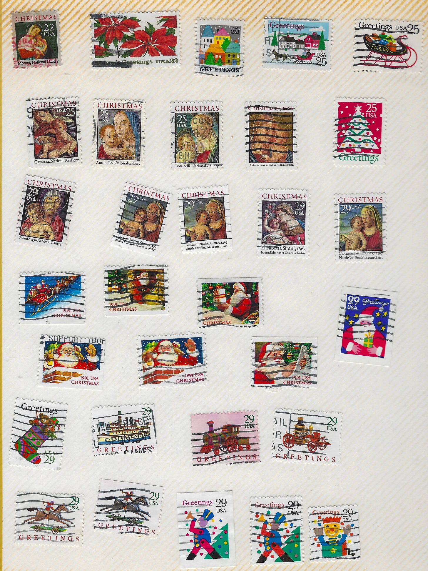 The first two pages of Christmas stamps from my amateur stamp collection. It is far from a complete collection, but it is still fun and the stamps are mostly from letters I and my family received (free).